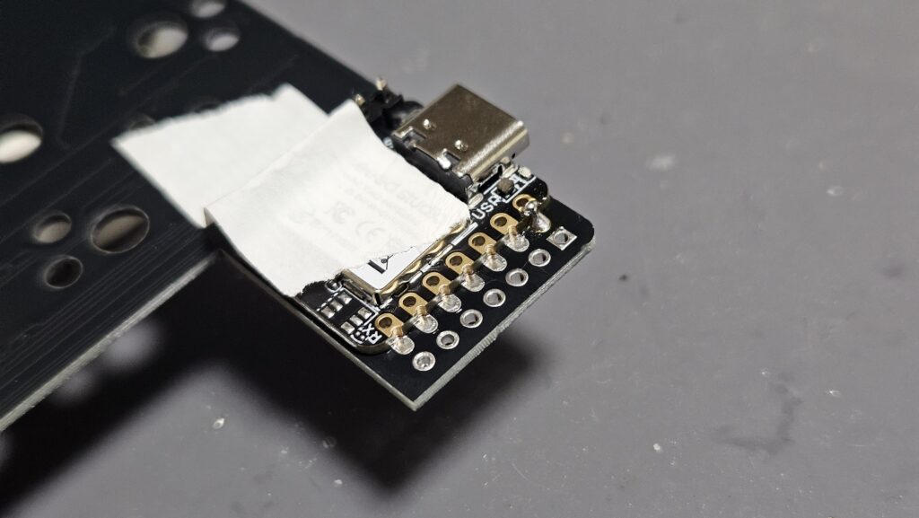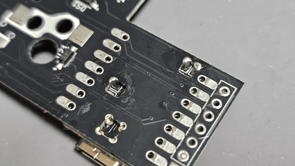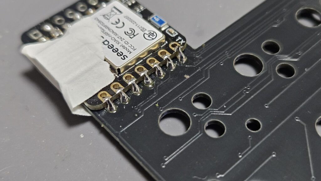 マイコンのパッドと基板のランドをはんだで接続しますが、穴が小さくランド同士も近いためはんだ付けの難易度がめちゃくちゃ高い。