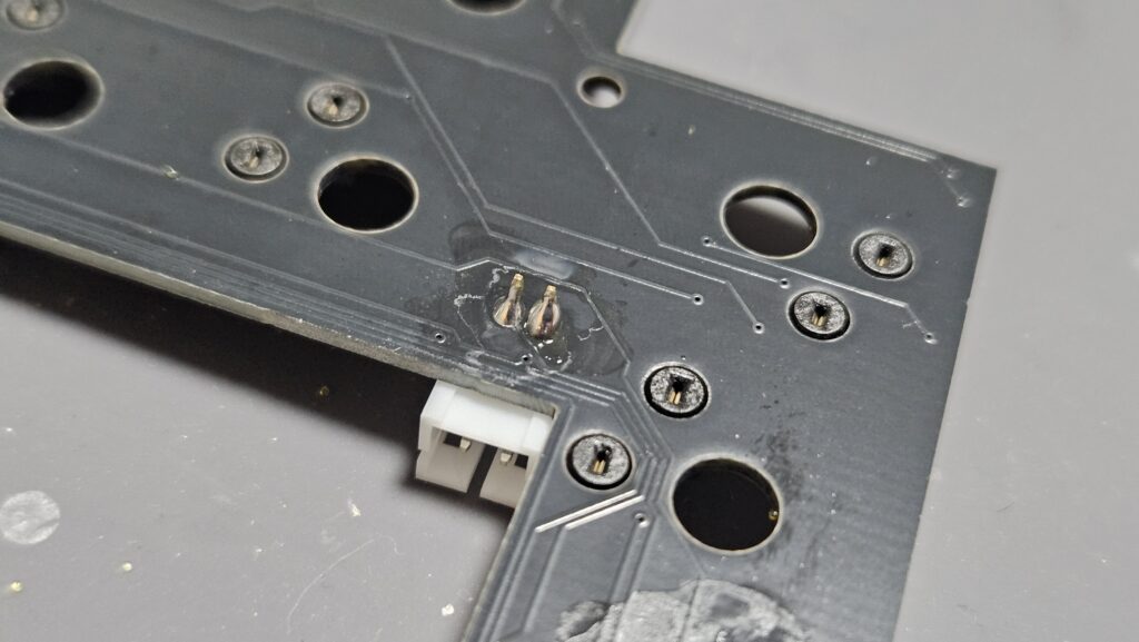 画像だとめちゃくちゃわかりづらいですが、空いている穴の四隅のランドが薄い金属片で繋がっています。